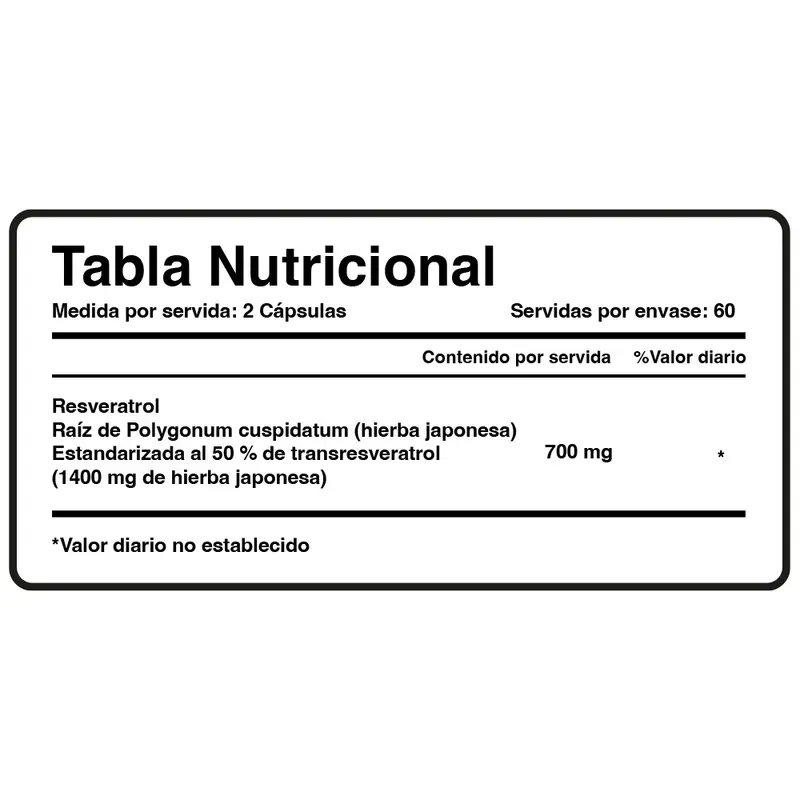 Obtenido a partir de una enredadera japonesa Knotweed (Polygonum cuspidatum) específicamente de la raíz de la planta, la fuente más rica en resveratrol conocida. Cada porción contiene 700 mg de resveratrol. Envase de 120 capsulas, con 60 porciones por envase. Libre de componentes genéticamente modificados. Producto vegano. Sin gluten.
