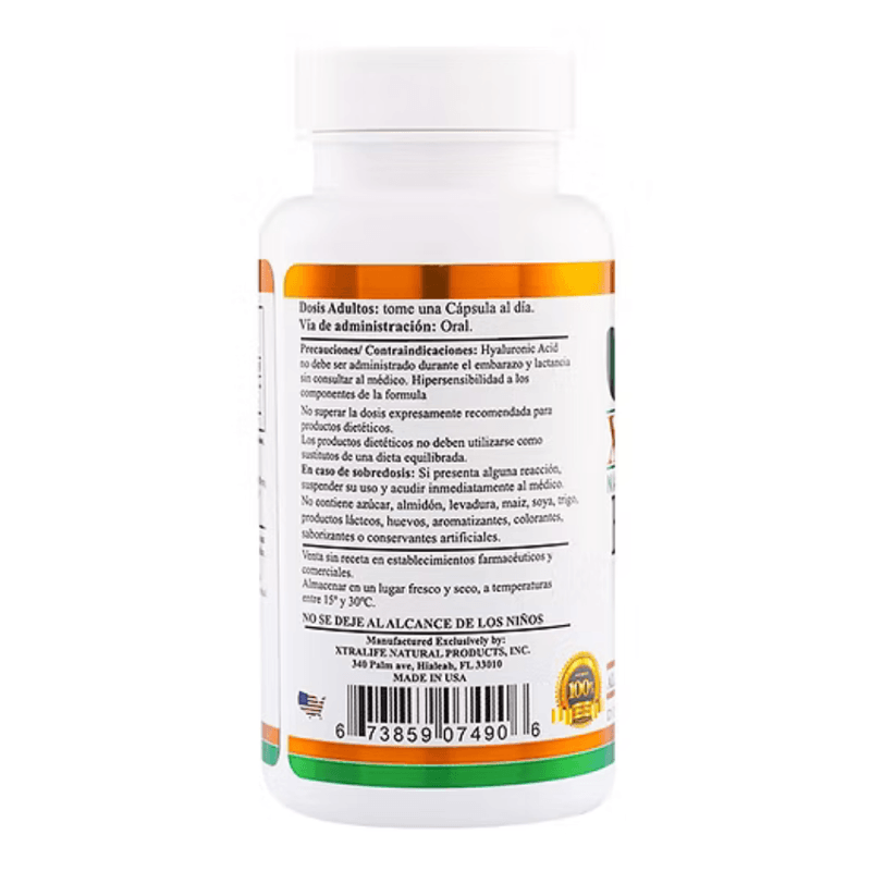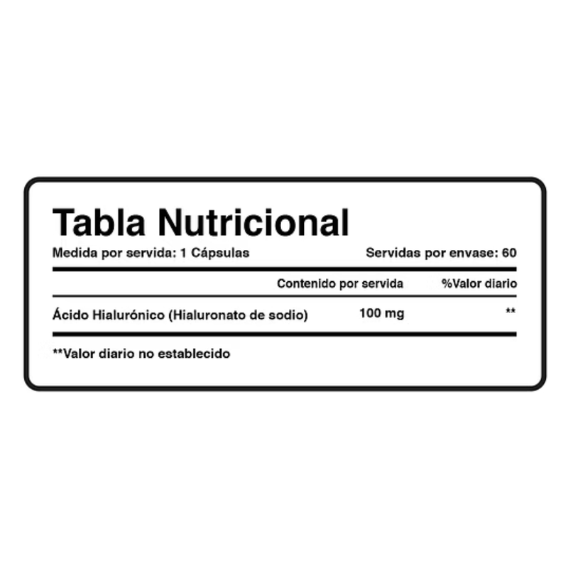 Cada capsula contiene 100 mg de acido hialuronico (hialuronato de sodio). Envase de 60 capsulas, con 60 porciones por envase.