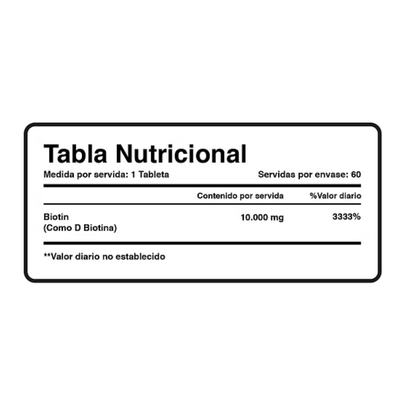 Cada capsula contiene 10.000 mcg de biotina (como d-biotina). Envase de 60 capsulas, con 60 porciones por envase.