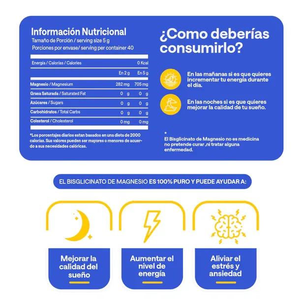 🥄 Añadir de 2 g a 5 g del producto en un vaso con agua. 🔄 Remover bien y consumir directamente. ⚠️ Evitar usar cucharas de metal porque disminuyen la absorción del magnesio en el cuerpo.