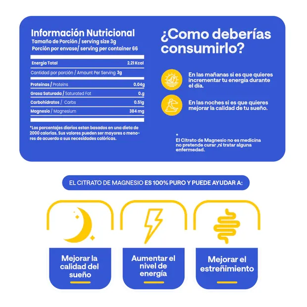 Citrato de Magnesio, suplemento que se obtiene al unir el ácido cítrico y el magnesio. Citrato de magnesio de origen aleman 100% puro. Con extracto natural de camu camu atomizado. Sin saborizantes artificiales. Sin azucar añadida. Sin gluten. Envase de 200 gramos, contiene 66 porciones.