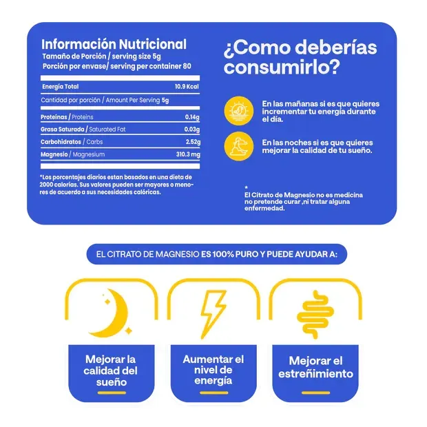 Citrato de Magnesio, suplemento que se obtiene al unir el ácido cítrico y el magnesio. Citrato de magnesio de origen aleman 100% puro. Con extracto natural de naranja y limon atomizados. Sin saborizantes artificiales. Sin azucar añadida. Sin gluten. Envase de 400 gramos, contiene 80 porciones.