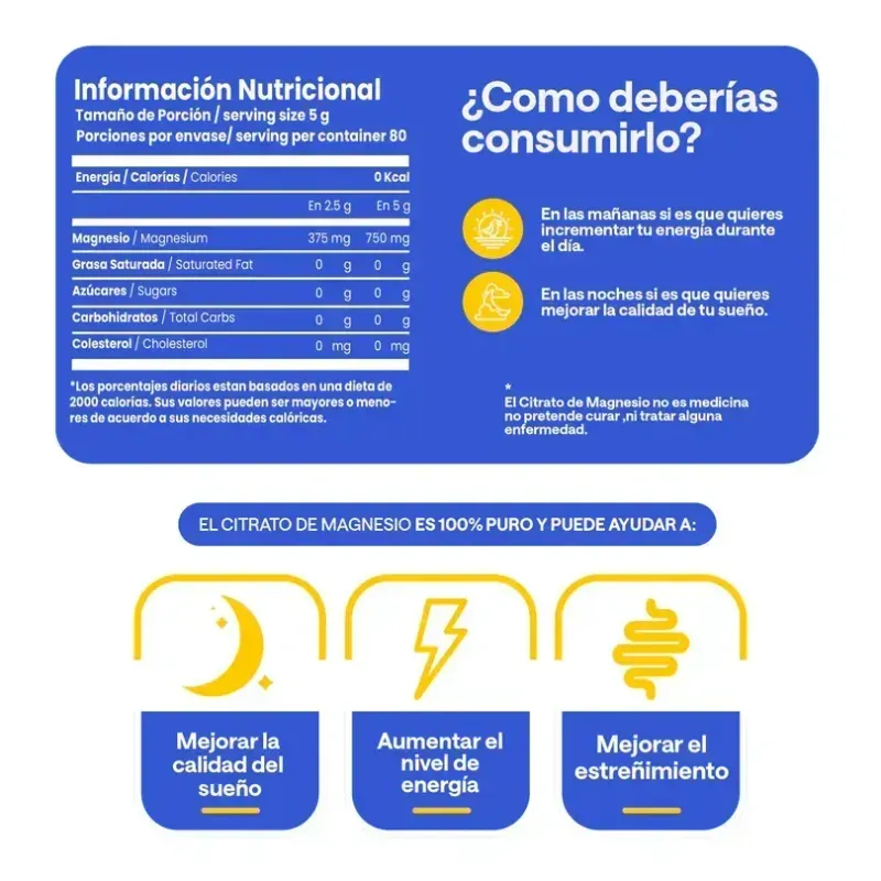 ¡Mejora tu salud! El citrato de magnesio de Smartblends es un suplemento que aporta magnesio en una forma de alta absorción. Ayuda a reducir el cansancio y la fatiga, apoya el buen funcionamiento de los músculos y el sistema nervioso, y contribuye al equilibrio de electrolitos. Es ideal para personas activas, con estrés o que buscan mejorar su descanso y energía diaria.