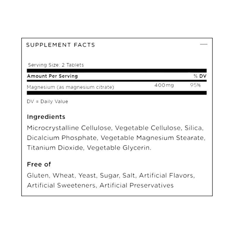 Cada porcion contiene 400 mg de magnesio (como citrato de magnesio). Sin gluten y sin lactosa. Producto vegano. Envase de 100 tabletas, con 50 porciones.