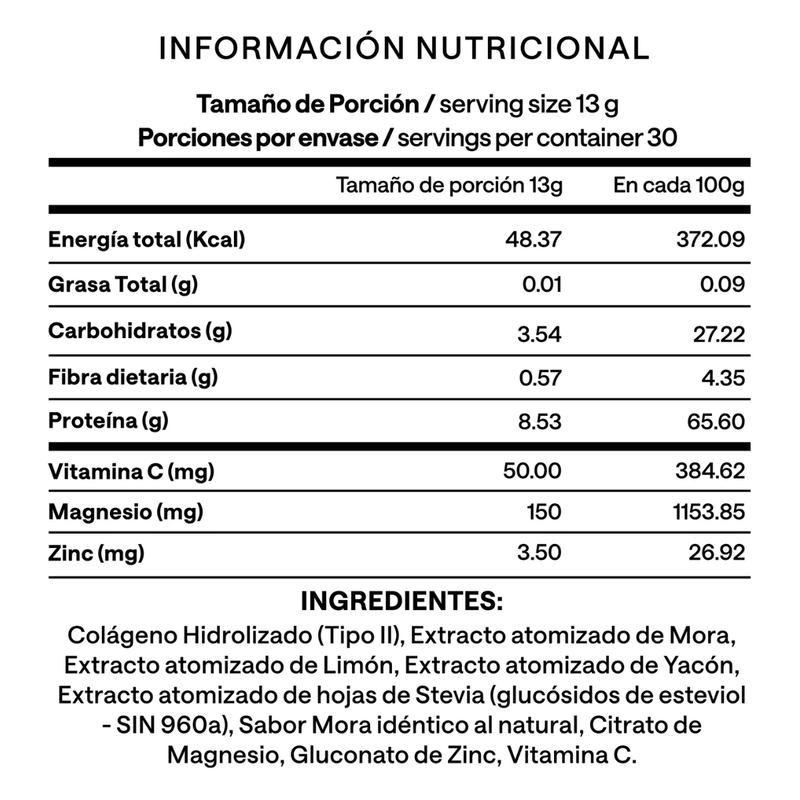 Producto elaborado a base de colágeno Hidrolizado tipo II, extracto atomizado de Mora, extracto atomizado de Limón, extracto atomizado de Yacón, extracto atomizado de hojas de Stevia (glucósidos de esteviol - SIN 960a), Sabor Mora idéntico al natural, Citrato de Magnesio, Gluconato de Zinc, Vitamina C. Contiene peptidos. Libre de azucar. Envase de 390 gramos, con 30 porciones por envase.