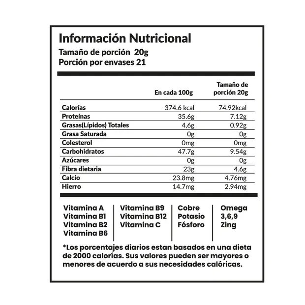 Elaborado a base de tarwi, kiwicha, espirulina, quinua y maca pura en polvo. Multivitamínico natural. Envase de 200 g. Contiene 10 porciones por envase. Sin azúcar. Libre de gluten. Producto vegano.