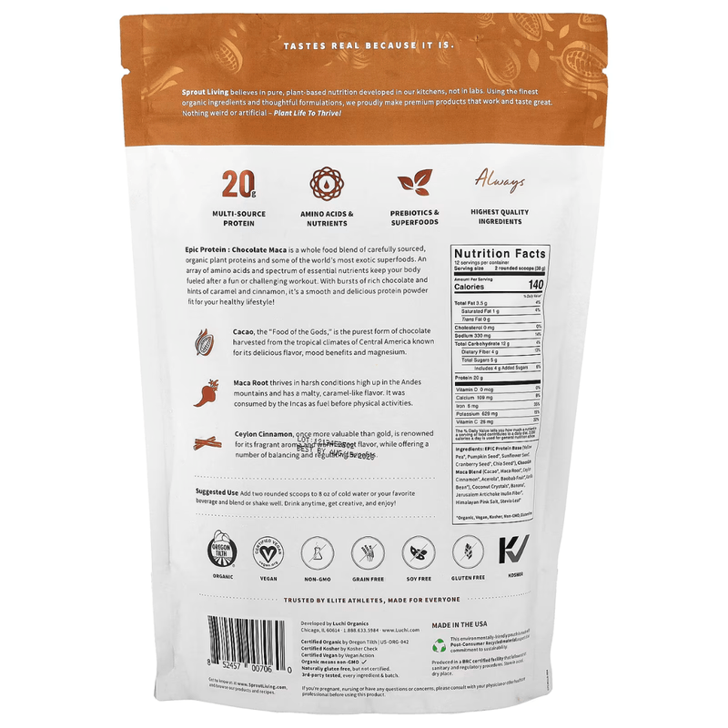 El Epic Protein Chocolate Maca de Sprout Living es una proteína vegetal en polvo orgánica y de gran calidad. Su fórmula combina distintas fuentes de proteína vegetal junto con superalimentos como cacao puro y maca, que aportan un perfil completo de aminoácidos esenciales para favorecer la recuperación y el crecimiento muscular. Con un sabor intenso y naturalmente delicioso, es ideal para preparar batidos, smoothies, postres o recetas energéticas. Además de ser fácil de digerir, está lleno de nutrientes que brindan energía sostenida, mejoran el rendimiento físico y apoyan el bienestar general. Una opción práctica y sabrosa para disfrutar de los beneficios de la proteína vegetal con un toque de chocolate y maca.