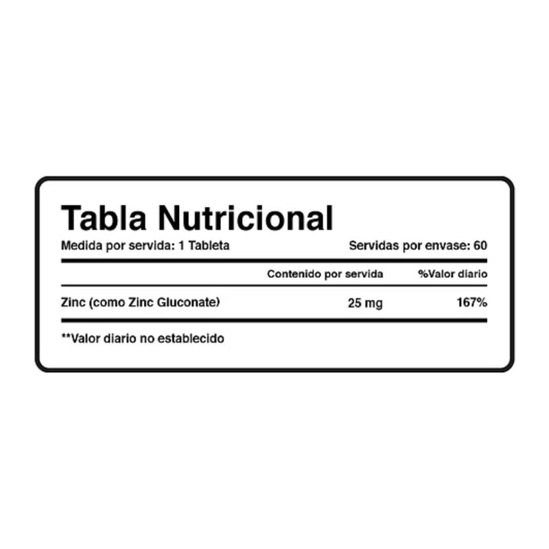 Cada tableta contiene 25 mg de zinc (como gluconato de zinc). Envase de 60 tabletas, con 60 porciones por envase.