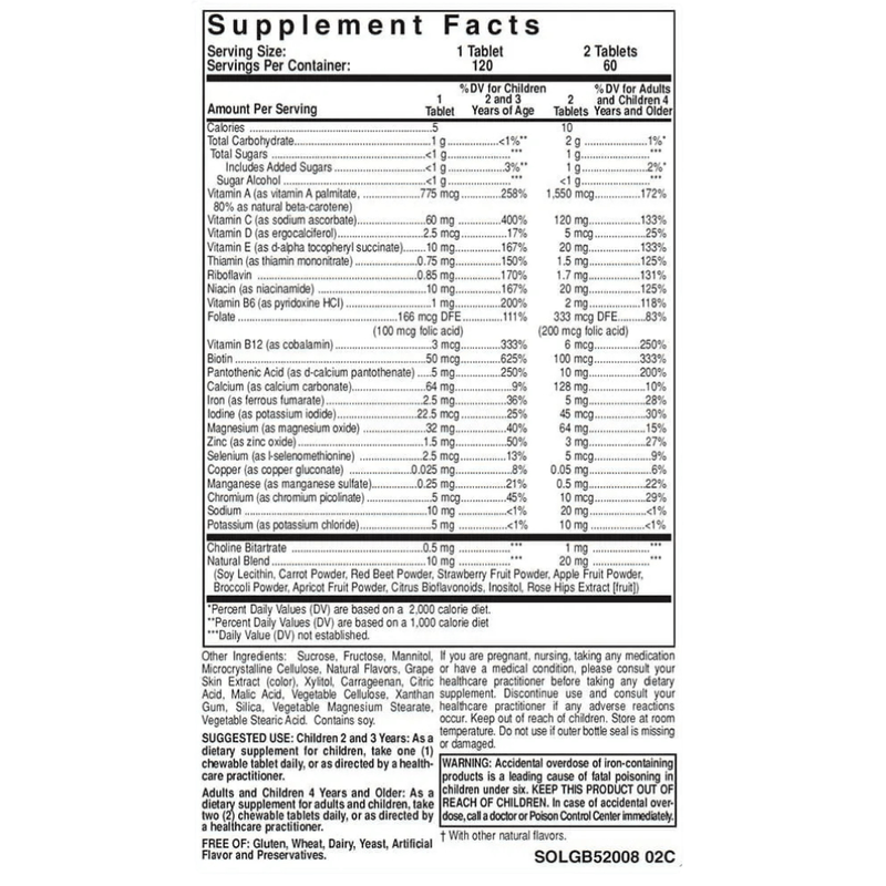 Cada tableta masticable contiene diferentes vitaminas como vitamina A, vitaminas B, vitamina C, vitamina D, vitamina E que son las que mas destacan. Ademas cada tableta masticable tambien contiene minerales como potasio, hierro, selenio, magnesio. Sin gluten. Producto vegano. Envase de 120 tabletas masticables.
