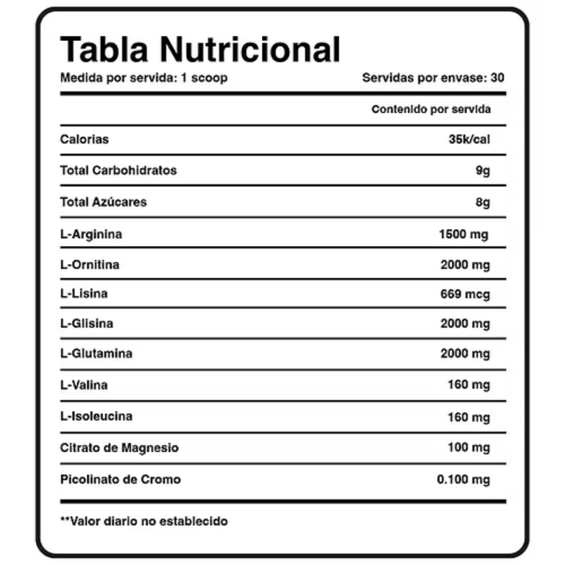 Contiene L-arginina, L-ornitina, L-lisina, L-glisina, L.glutamina, L-valina, L-isoleucina, citrato de magnesio y picolinato de cromo. Producto en polvo sabor naranja. Envase de 270 gramos, con 30 porciones por envase.
