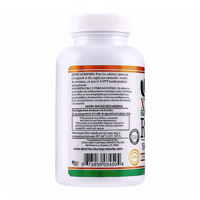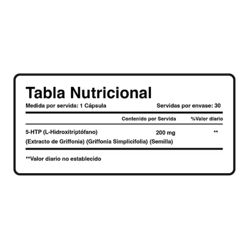 Cada capsula contiene 200 mg de 5-HTP (L-hidroxitriptofano) (de extracto de Griffonia) (Griffonia simplicifolia) (Semilla). Envase de 30 capsulas, con 30 porciones por envase.