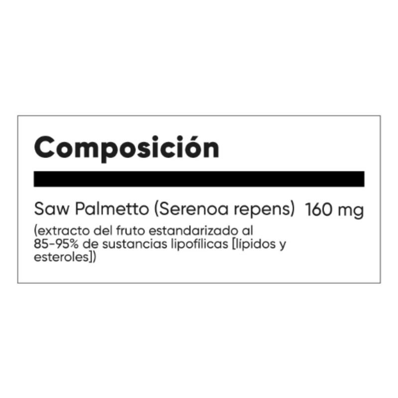 Cada capsula blanda contiene 160 mg de extracto de saw palmetto (serenoa repens) (baya) (estandarizado para contener 85-95% acidos grasos totales). Incluye aceite de oliva virgen extra. Sin gluten y sin soya. Envase de 60 capsulas blandas, con 60 porciones por envase.