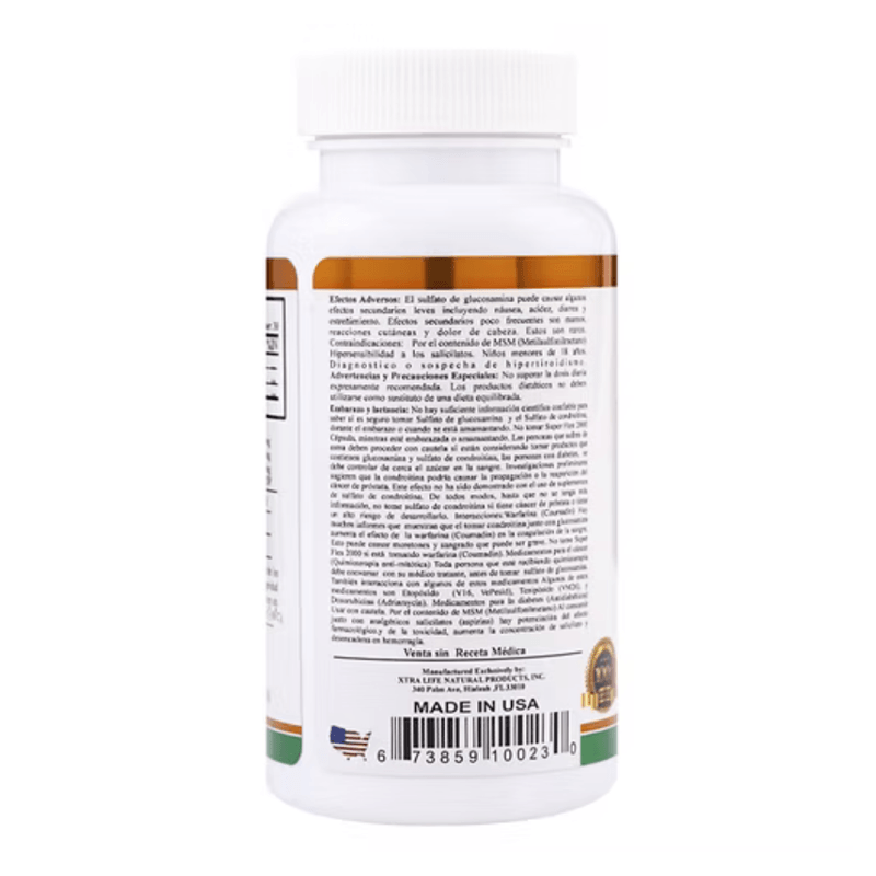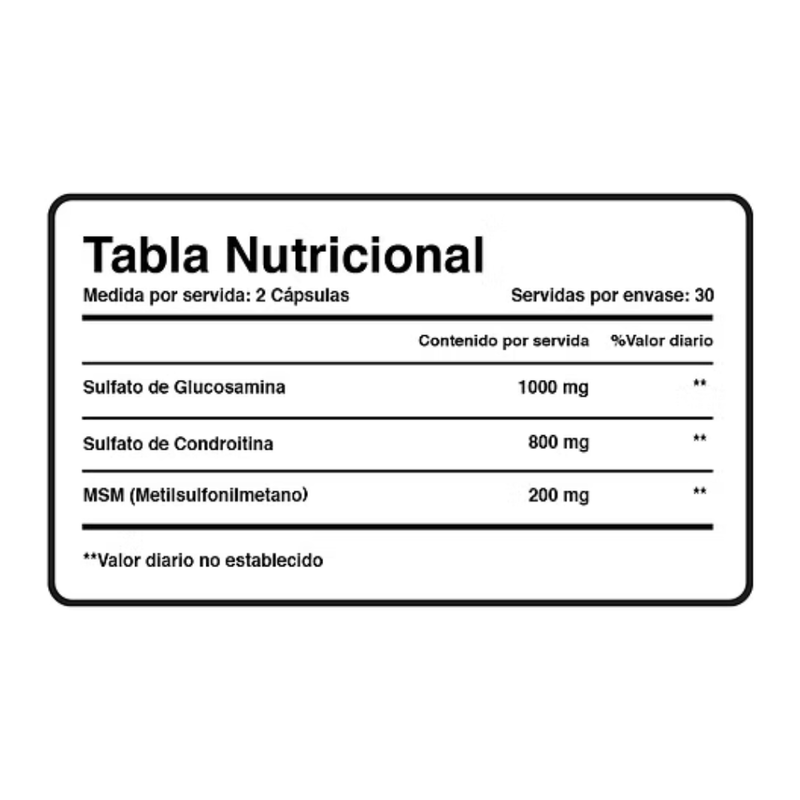 Cada capsula contiene 1000 mg de sulfato de glucosamina, 800 mg de sulfato de condroitina y 200 mg de MSM (metilsulfonilmetano). Envase de 60 capsulas, con 30 porciones por envase.