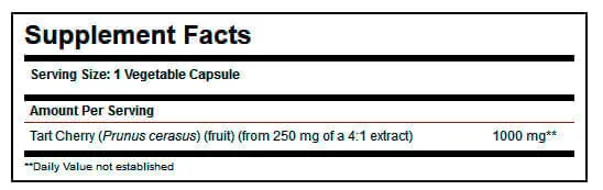 Contiene 1000 mg de cereza ácida (Prunus cerasus) en cada cápsula vegetal. Sin gluten, sin lactosa, sin azúcares añadidos ni colorantes artificiales. Producto vegano. Envase de 90 cápsulas, con 90 porciones por envase.