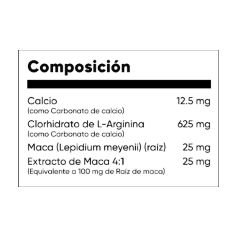 Cada capsula contiene 12.5 mg de calcio (como carbonato de calcio), 625 mg de clorhidrato de L-arginina, 25 mg de maca (lepidium meyenii) (raiz), 25 mg extracto de maca 4:1 (equivalente a 100 mg de raiz de maca). Sin gluten, sin azucar, libre de lacteos. Envase de 80 capsulas, con 20 porciones por envase.