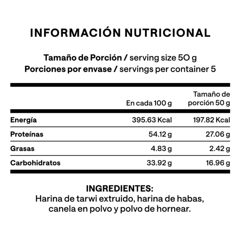 Mezcla proteica para hacer waffles a base de harina de tarwi extruido, harina de habas, canela en polvo y polvo de hornear. Cada 100 gramos brinda 54.12 gramos de proteina. Producto libre de gluten, sin azucar. Envase de 250 gramos.