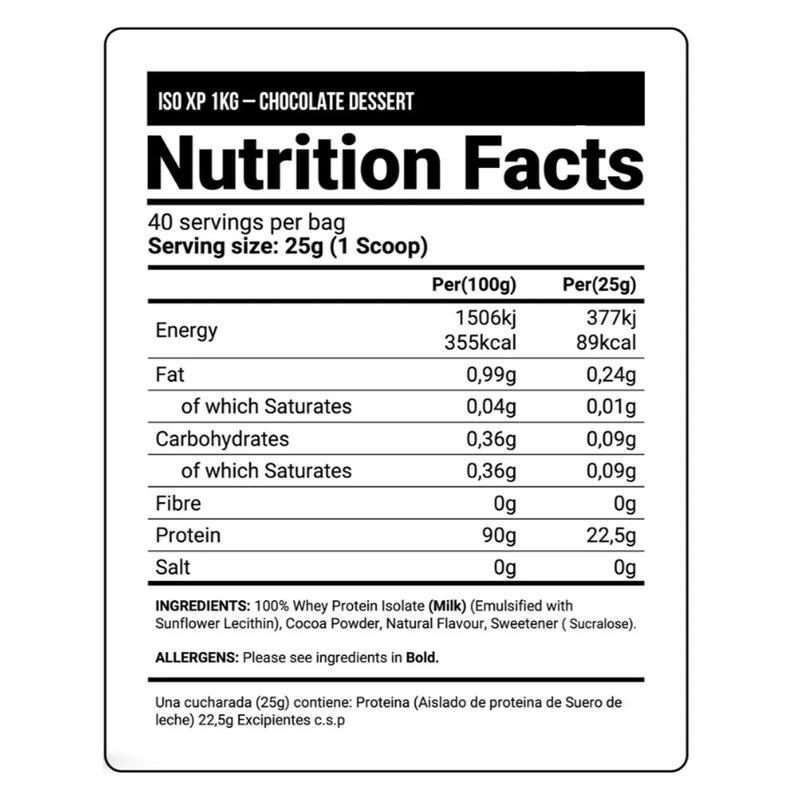 Proteina de suero de leche whey isolatada. Cada porción de 25 gr (1 scoop) contiene 89 kcal y 22.5 gr de proteína, 5.3 gr de BCAA, 0.24 gr de grasas totales y 0 gr de carbohidratos. Producto endulzado con sucralosa. Envase de 1 kg, con 40 porciones.